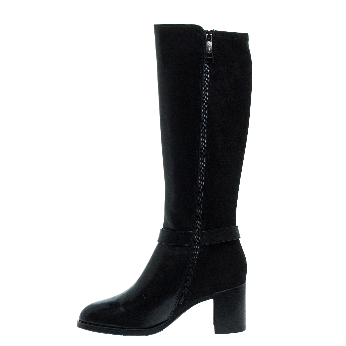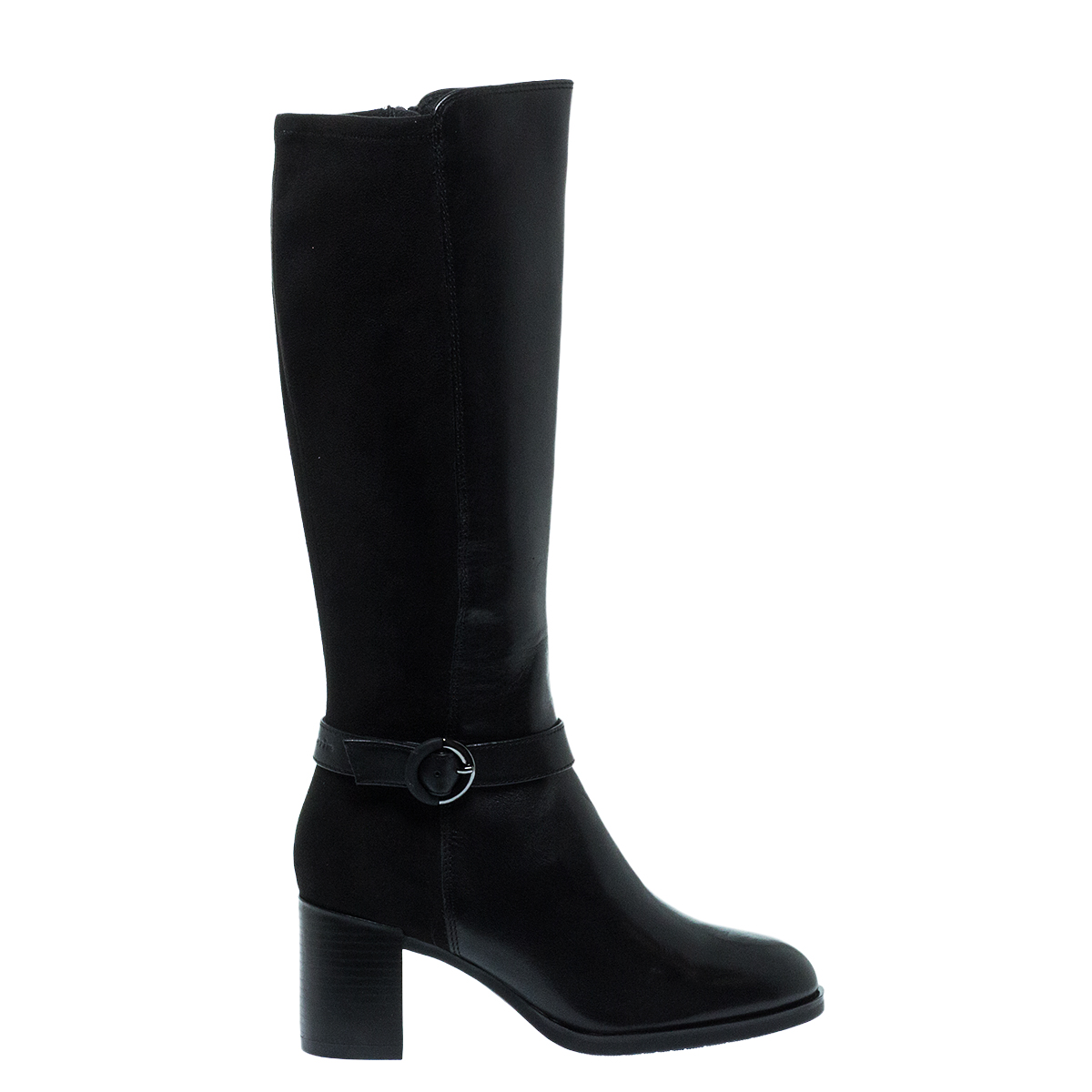 ●Μαύρο δέρμα εξωτερικά με ελαστικό suede ύφασμα στη γάμπα και αγκράφα στο πλάι