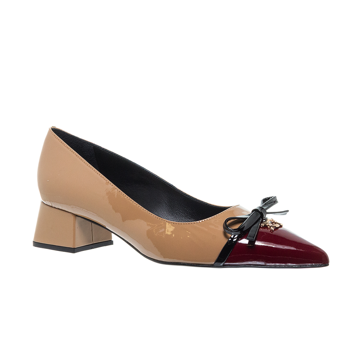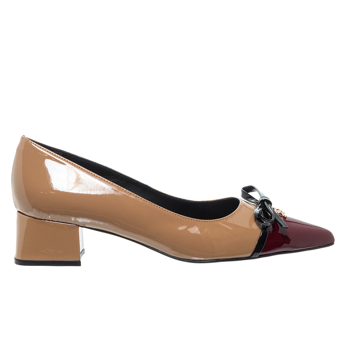 ●Κάμελ λουστρίνι δέρμα εξωτερικά με μπορντό λουστρίνι λεπτομέρεια μπροστά,μαύρο λουστρίνι φιογκάκι και μικρό χρυσό